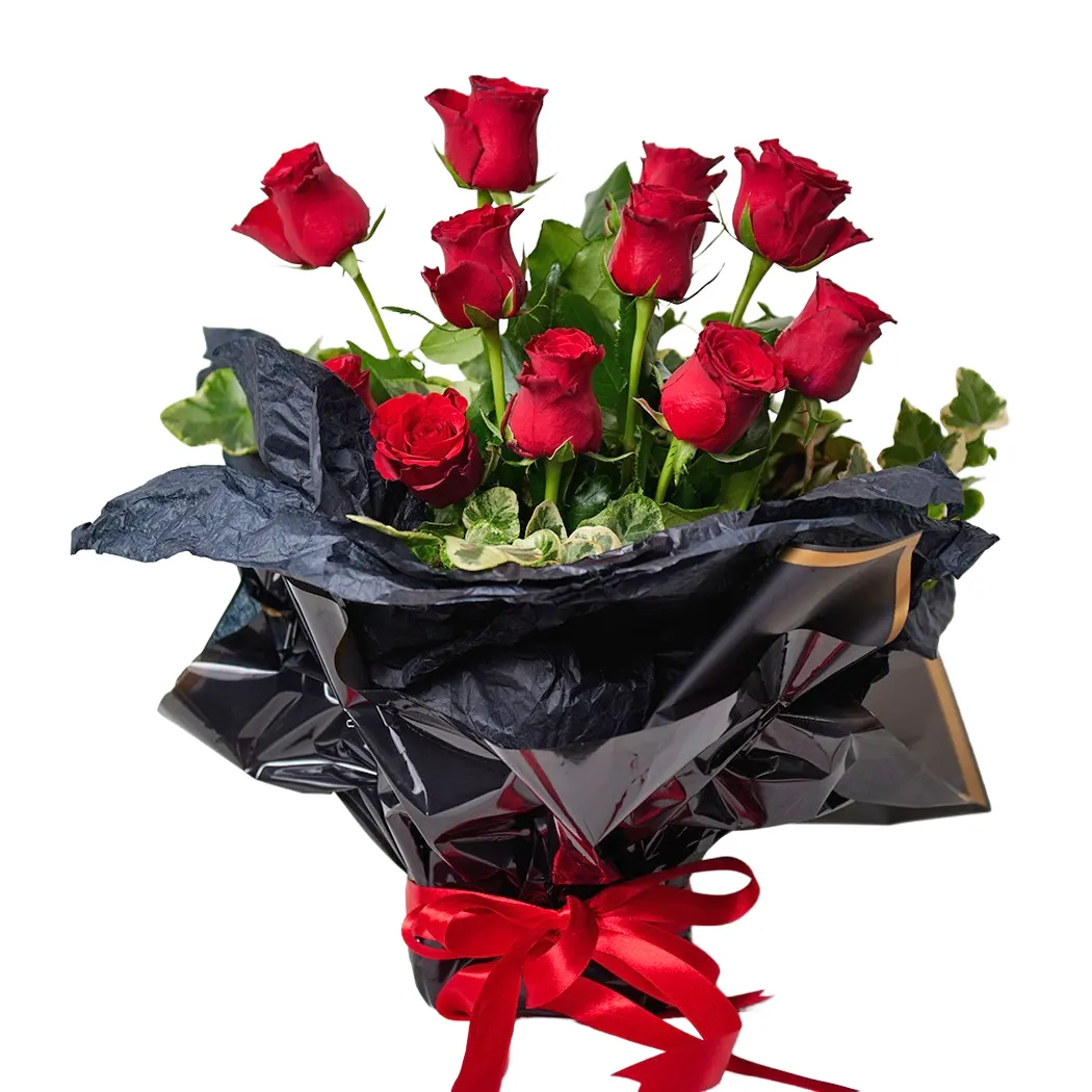 Surprindeți persoana iubită cu un aranjament floral clasic și elegant, creat din 11 trandafiri roșii vibranți, înconjurați de verdeață proaspătă, ambalat cu grijă în hârtie de mătase neagră.