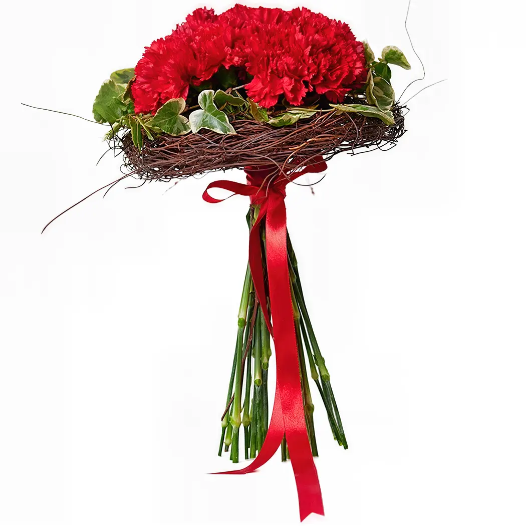 Un buchet clasic și elegant, creat din garoafe roșii vibrante și iederă verde proaspătă, așezate cu grijă pe un suport din sisal natural. Cadoul perfect pentru a celebra Ziua Îndrăgostiților sau orice altă ocazie specială.