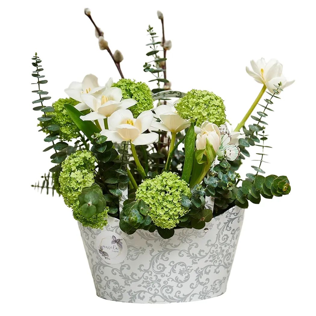 Un aranjament floral vibrant și energic, creat din lalele albe clasice, viburnum delicat, salix natural și eucalipt parfumat, așezat cu grijă într-un coș rustic din materiale naturale