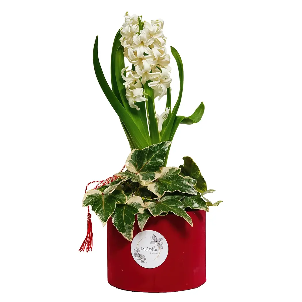 Un martisor delicat și parfumat, creat dintr-un bulb de zambilă albă proaspătă, decorat cu iedera verde, așezat elegant într-o cutie roșie de catifea!