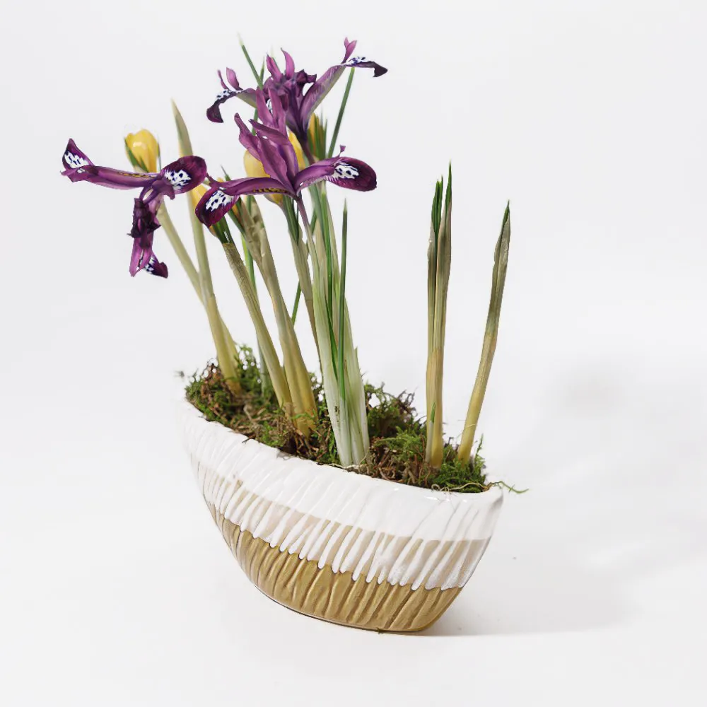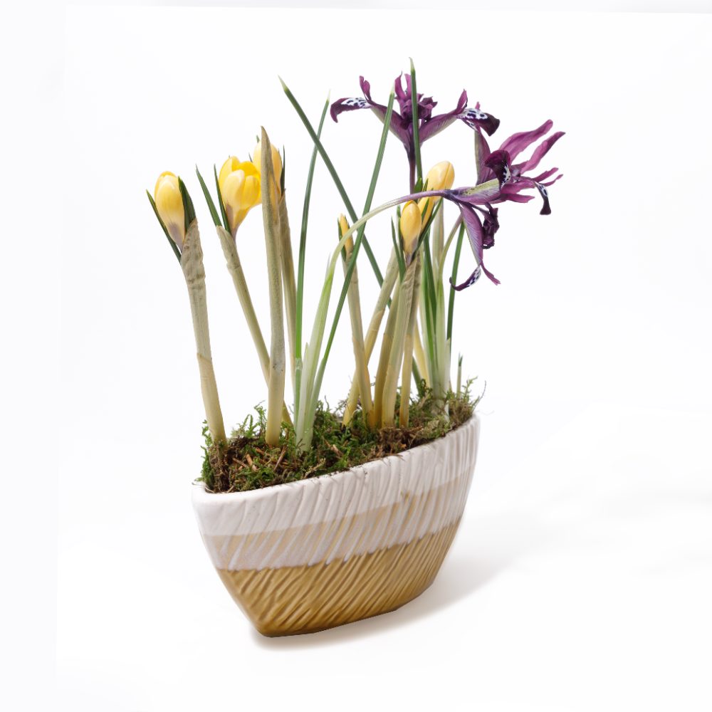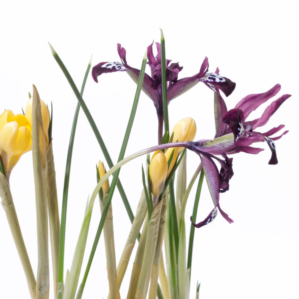 - Flori: Iris mov (Iris reticulata) și bulbi de crocus galben, gata să înflorească.